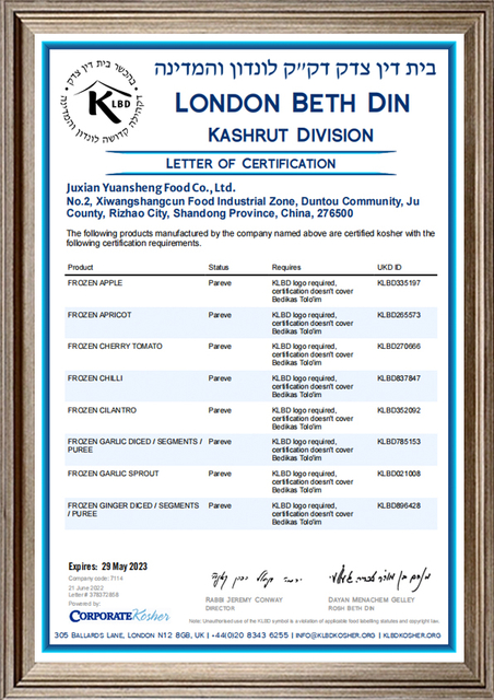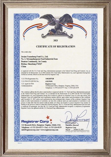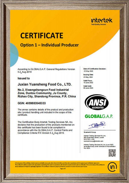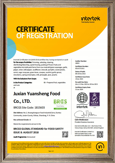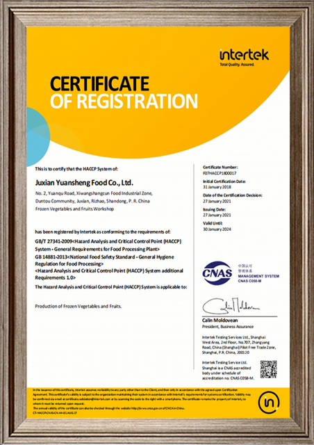 Juxian Yuansheng Food Co., Ltd. criada em 2016, uma empresa privada de ações conjuntas para exportar vegetais congelados.